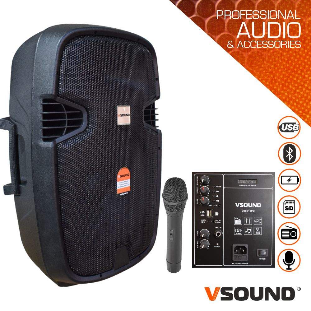 Coluna Amplificada 15″ USB/BT/SD/FM/BAT MIC S/ Fios VSOUND